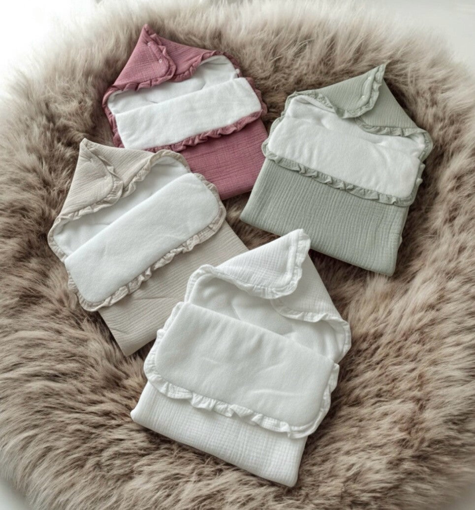 Confectionné dans des tissus gaze de coton & polaire, ce nid d'ange est le cadeau de naissance idéal.